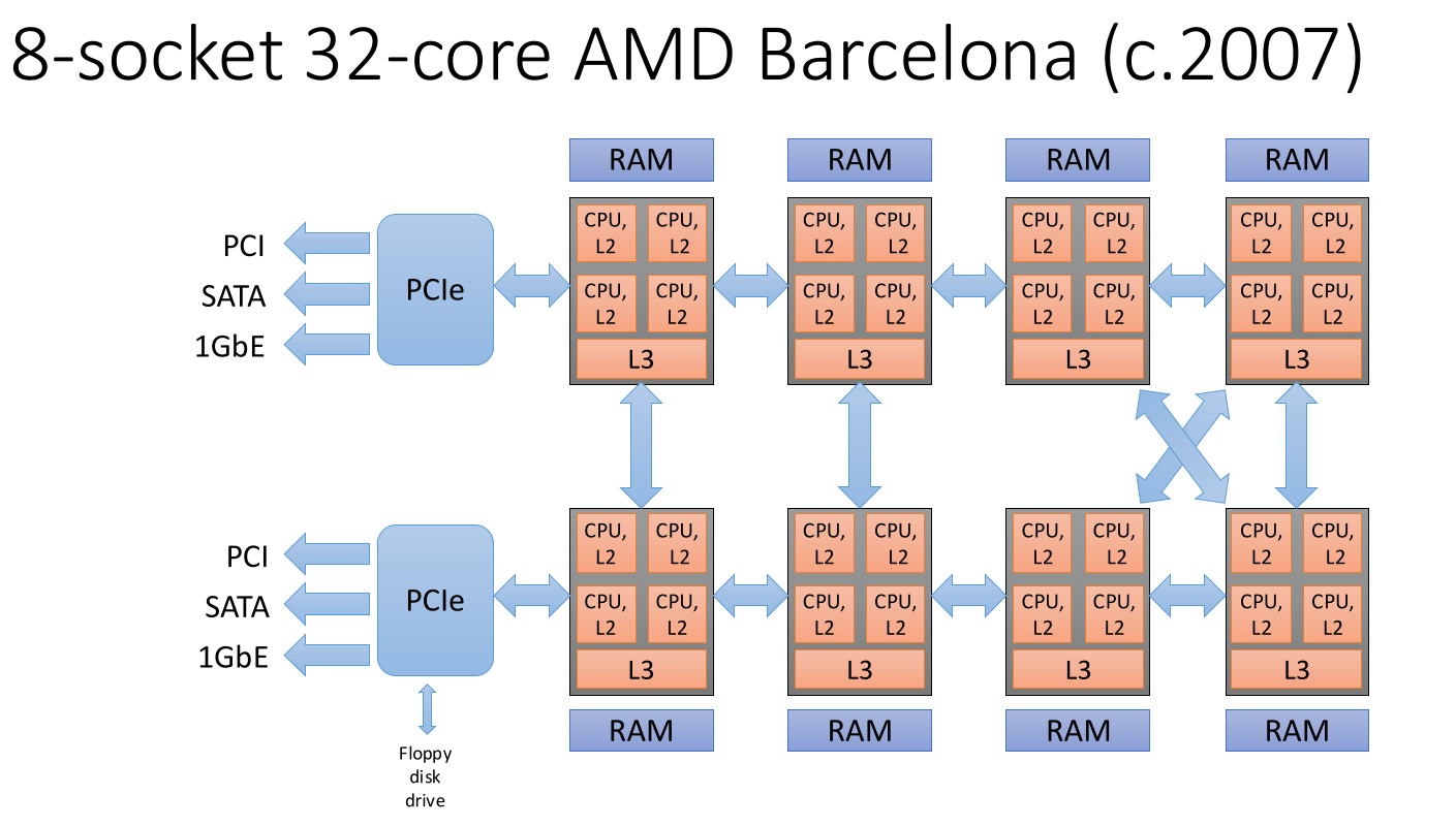 - Sockets are connected via a high-speed interconnect (e.g., Intel QPI/UPI, AMD HyperTransport).