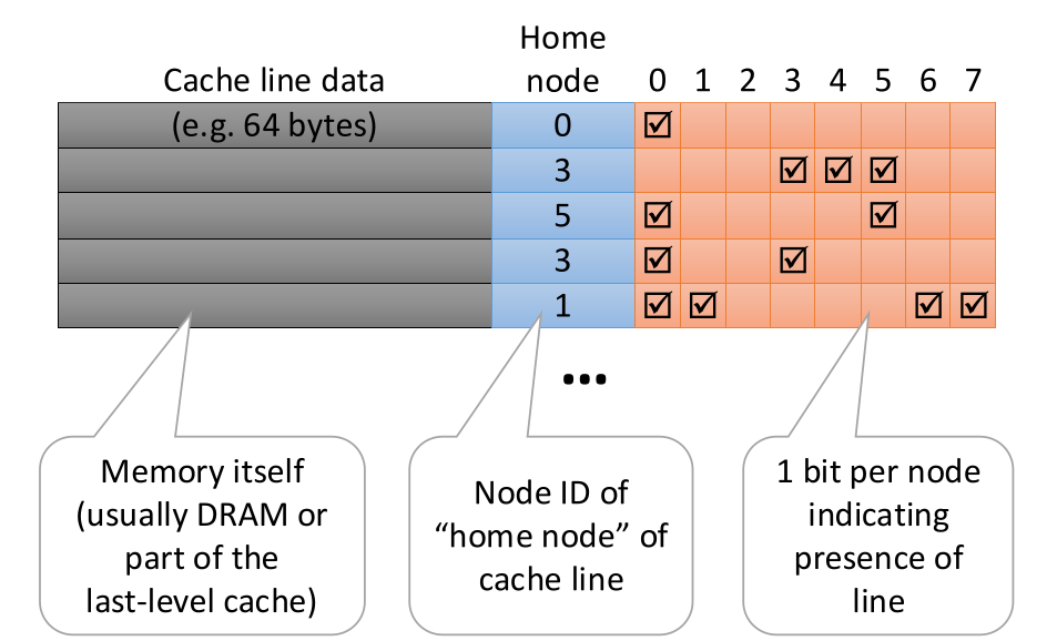 - The Home Node checks the Directory. It contains a bitmask of which nodes hold a copy.