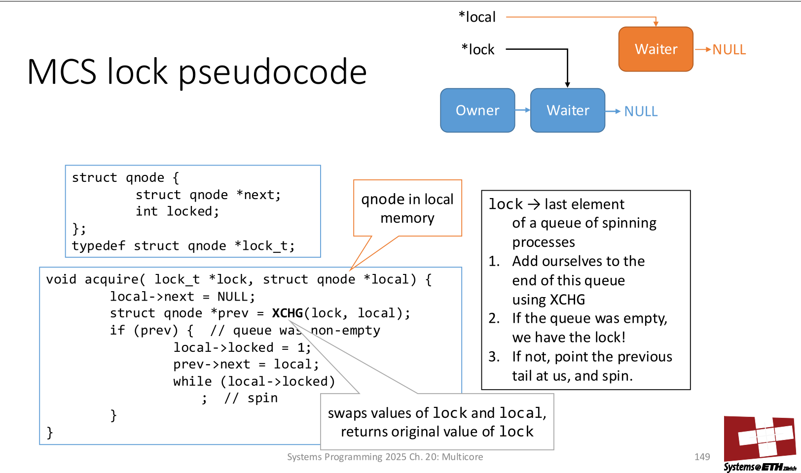 XCHG(swap) on the globalLockpointer. It swaps its own node in as the new Tail. - It gets back the address of the previous tail.