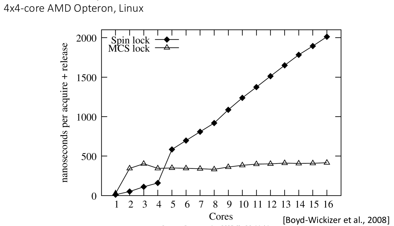 - MCS Lock: Flat performance. The time to acquire/release is constant regardless of how many other threads are waiting. This is the gold standard for high-contention locks.