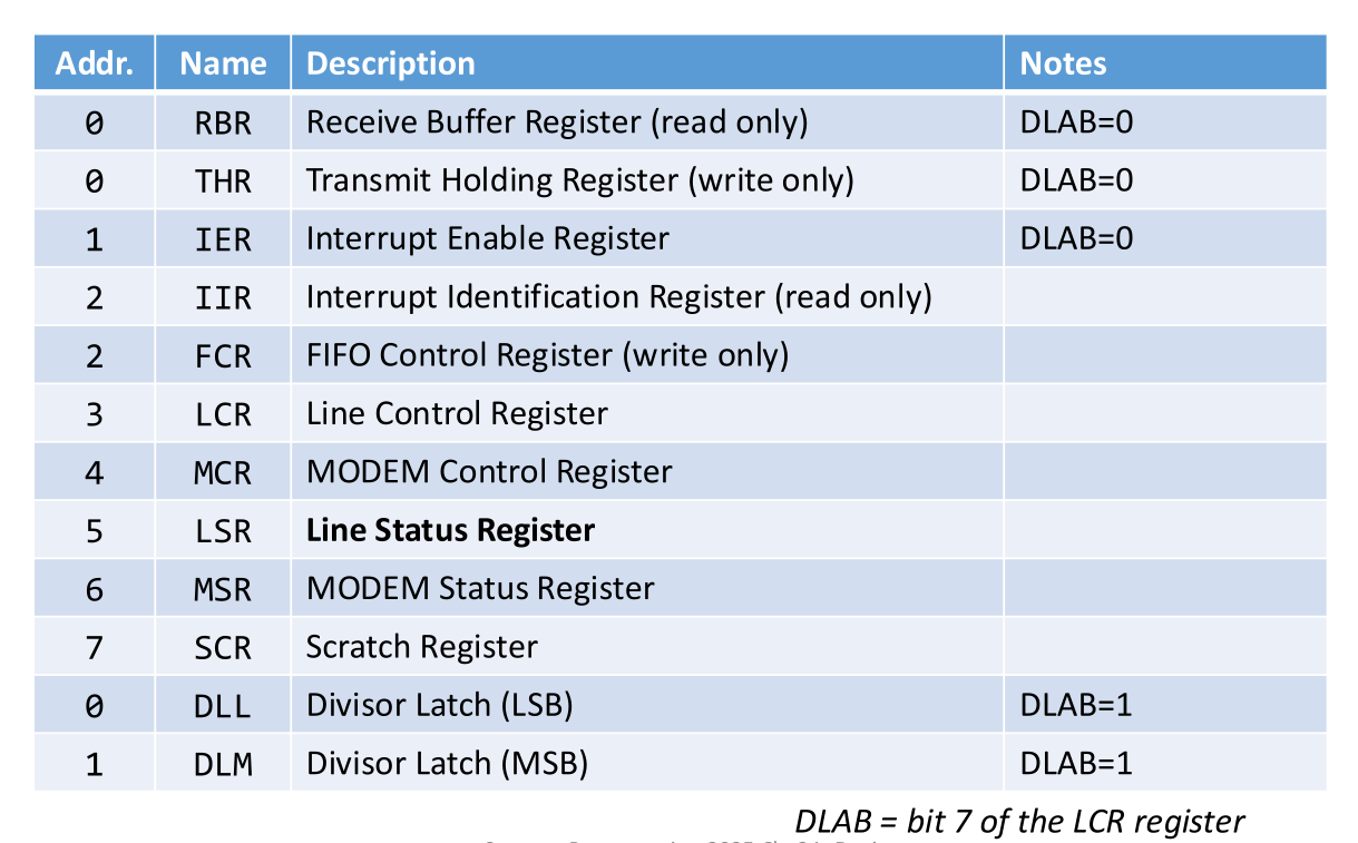 #define UART_LSR 5 // Line Status Register (Read status here)