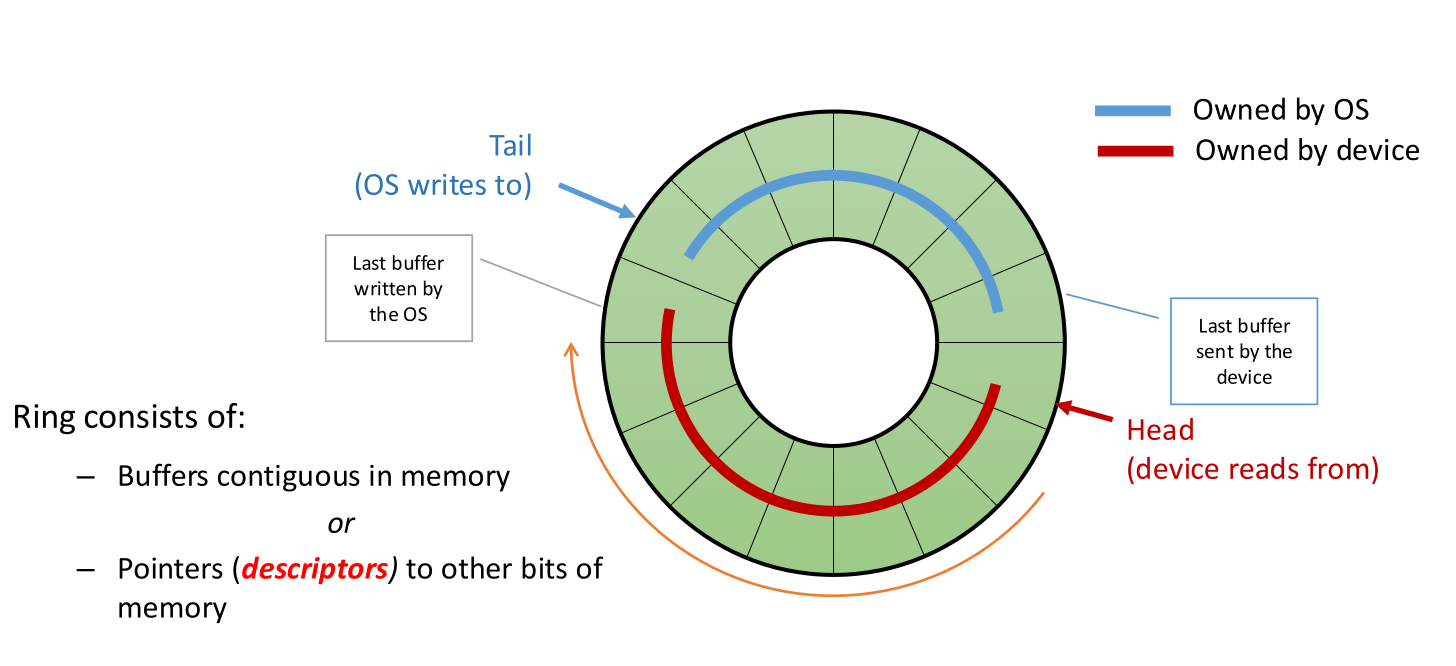- Overrun: Device receives packets faster than OS can process. The ring fills up (Head crashes into Tail). The device must drop packets.