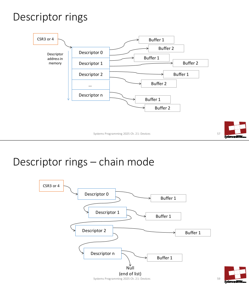 - Ring Mode: Descriptors are in a contiguous array. The hardware wraps around automatically.