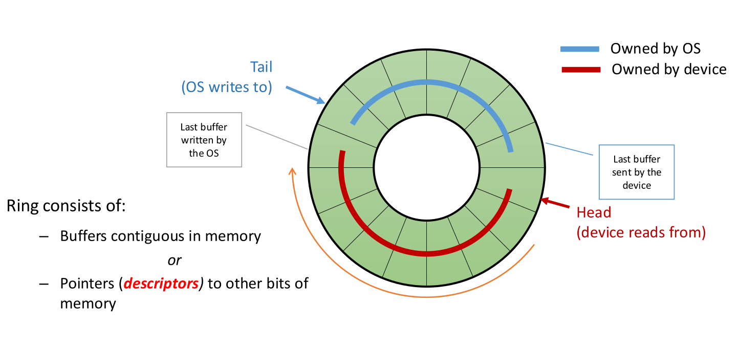 - Descriptor Ring: The ring contains descriptors (pointers). Each descriptor points to a data buffer located elsewhere in memory. This is more flexible as buffers can be scattered in physical memory.