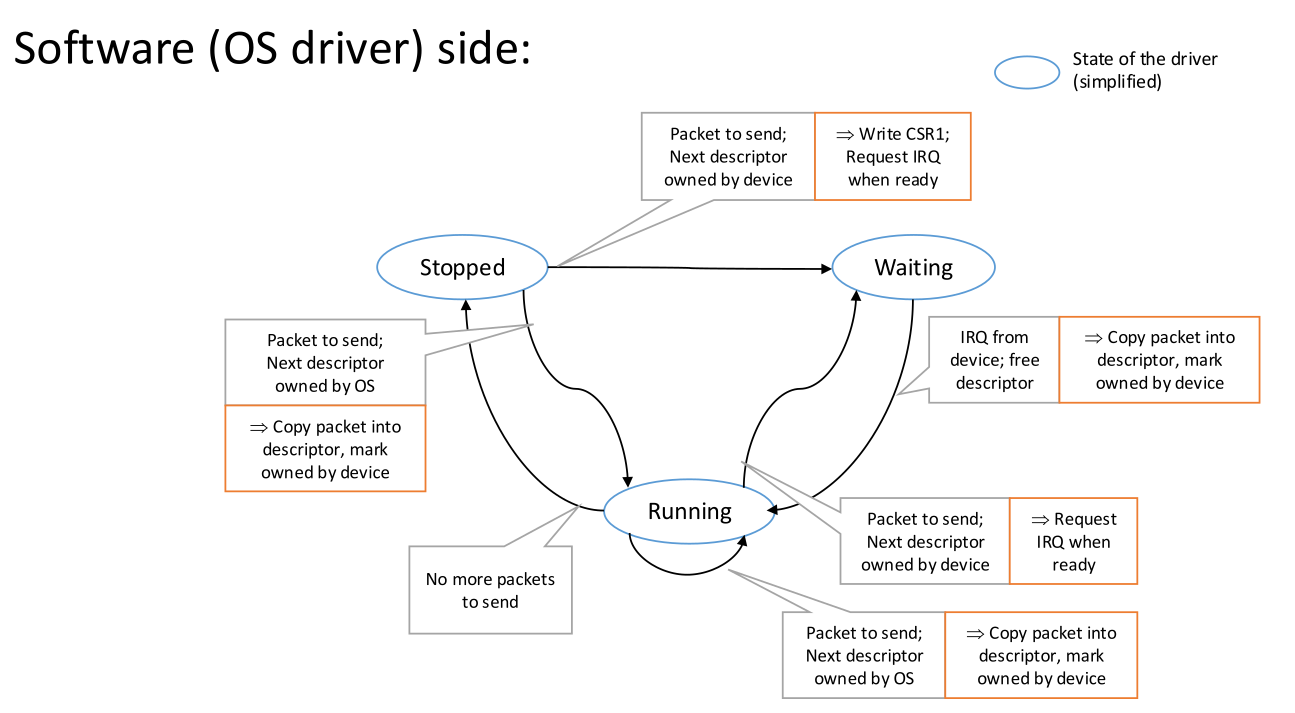 The interaction between the driver and the device can be modeled as two communicating state machines. The example of Sending Packets (Transmit) is examined below.