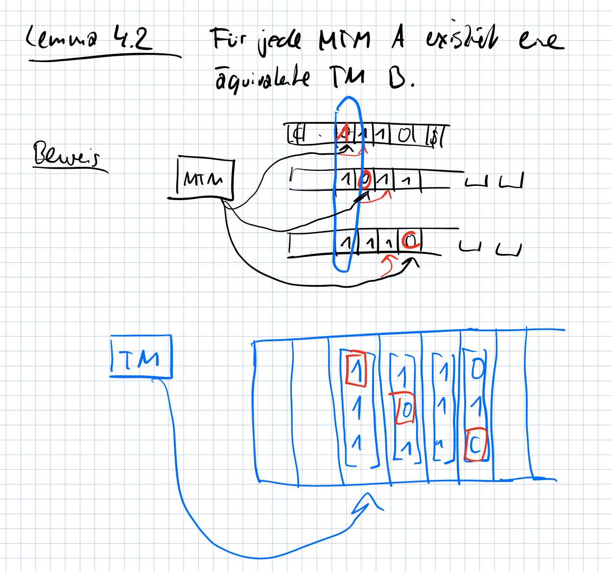 Lemma 4.2: For every MTM , there exists an equivalent single-tape TM . This is the heart of the proof. We need to show how a single tape can simulate multiple tapes.