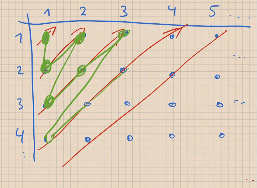 Is the set of pairs countable? It seems “larger” than , like a 2D plane vs. a line. However, Cantor showed it is countable using a diagonalization argument (specifically, traversing anti-diagonals).