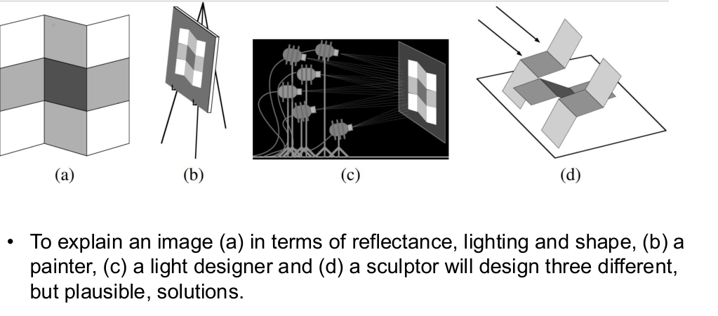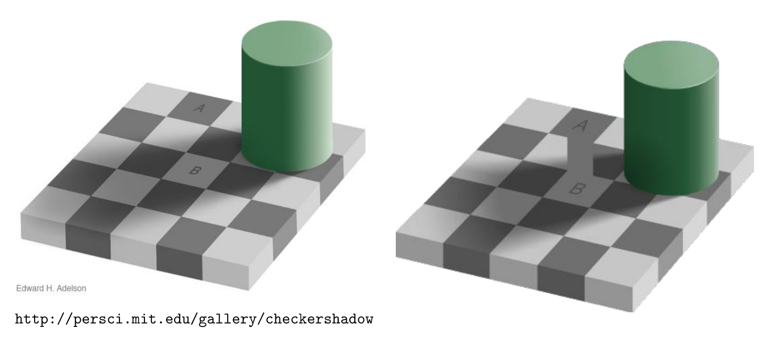 - Perception vs. Measurement: Our visual system is an interpretation engine, not a photometer. The famous checker shadow illusion by Edward Adelson is the quintessential example. In this image, two checkerboard squares, labeled A and B, appear to be very different shades of gray. In truth, their pixel values are identical. Our brain, using its built-in knowledge of how shadows work, automatically brightens square B in our perception. A computer, reading the raw data, would see no difference. This highlights the gap between raw measurement and contextual interpretation.