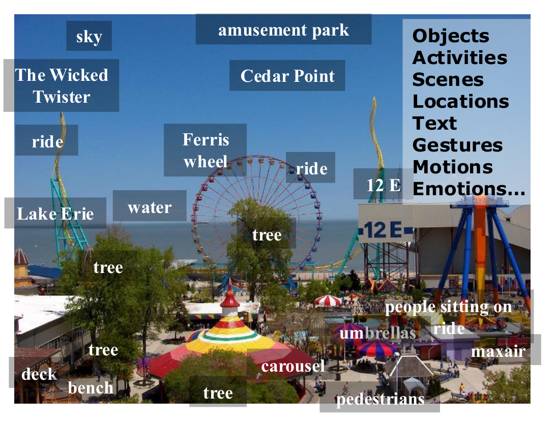 The second, and arguably more profound, pursuit is to imbue machines with the ability to understand the meaning within an image. This is not about measuring distances, but about identifying concepts. Given an image of an amusement park, we want a system that can label the objects (Ferris wheel, carousel), describe the activities (people sitting on a ride), and summarize the scene (an amusement park on a sunny day). This is about turning pixels into knowledge.