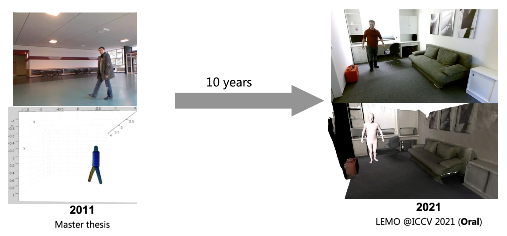 The pace of change in this field is staggering. For the lectures own Master’s thesis, roughly 14 years ago, the task was to track human motion from a single depth camera. The result, after much effort, was a crude model of connected cylinders, and it didn’t even have arms, as they were too difficult to track reliably!