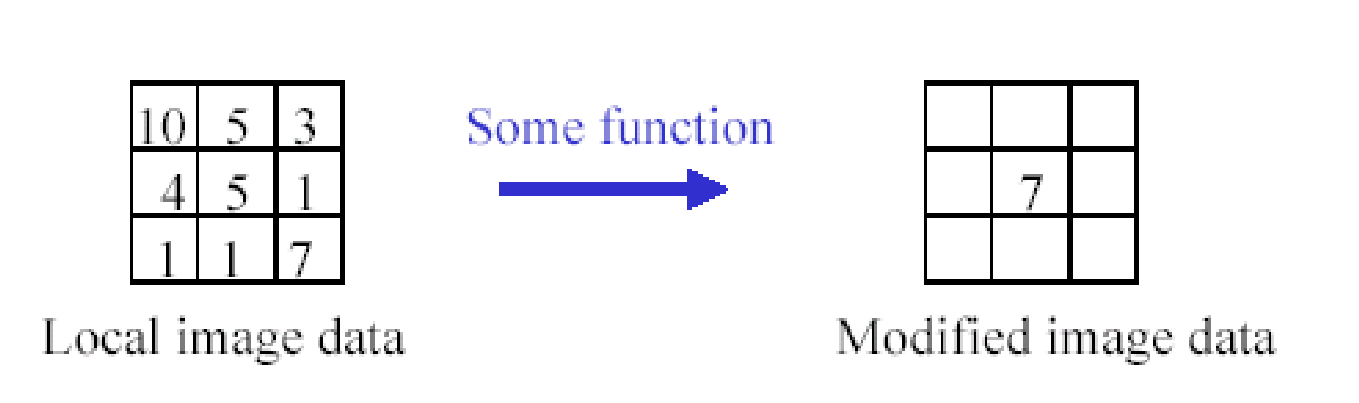 Imagine sliding a small window across an image. At each position, we look at the pixel values inside the window, apply some mathematical function to them, and use the result to compute the new value for the center pixel in our output image.