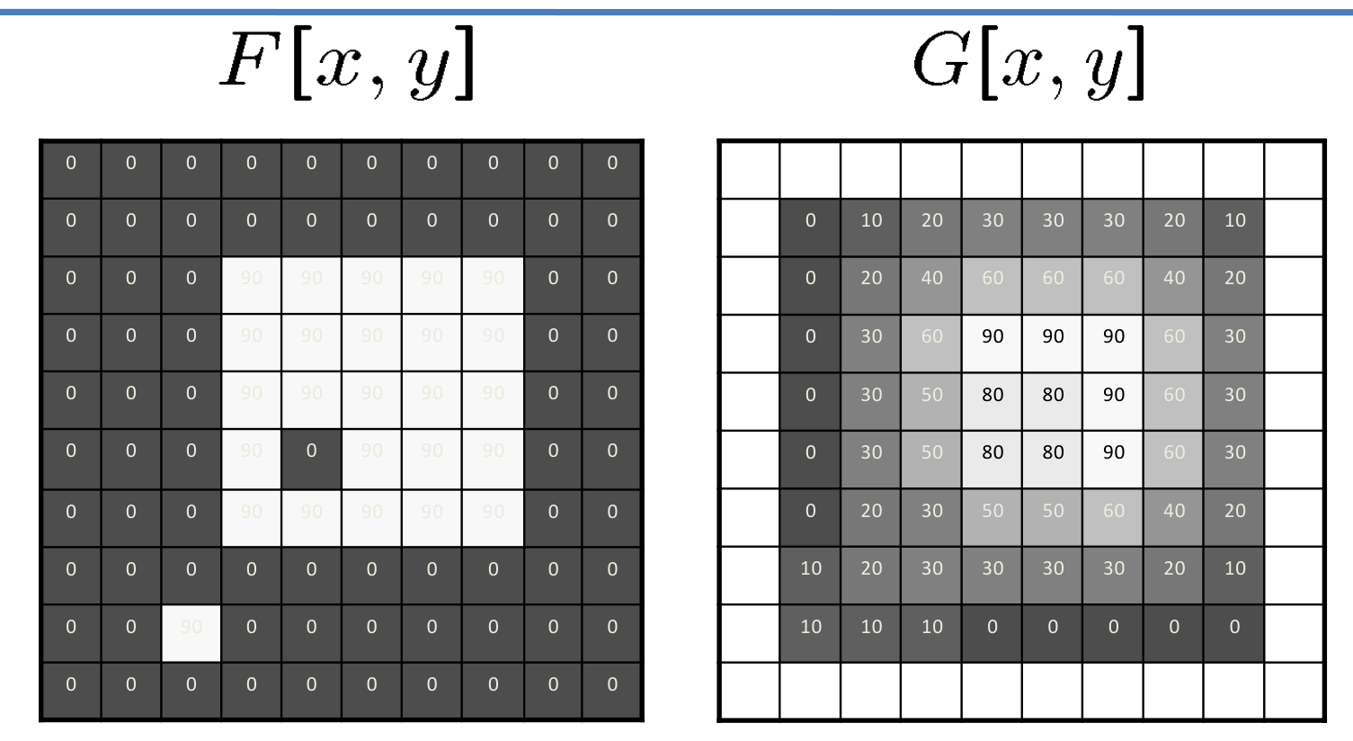 As the averaging window slides across the image, you can see the effect. Outlier pixels (like the 90 in a sea of 0s) are suppressed, and the sharp boundary between the 0 and 90 regions becomes blurred. The noise is reduced, but at the cost of some image sharpness.