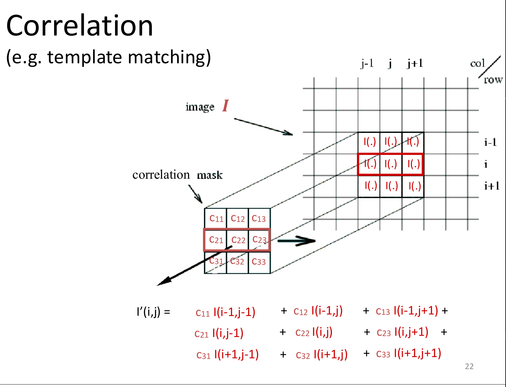 Correlation is the most direct implementation of the formula above. To compute the output at , we overlay the kernel onto the image neighborhood centered at , multiply the corresponding elements, and sum the results.