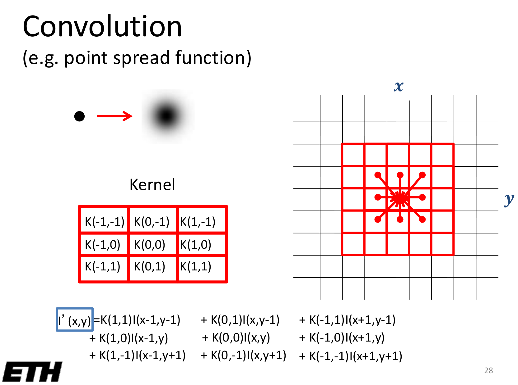 Any LSI filtering operation can be written as a weighted sum over a neighborhood. The output image at pixel is computed from the input image as: