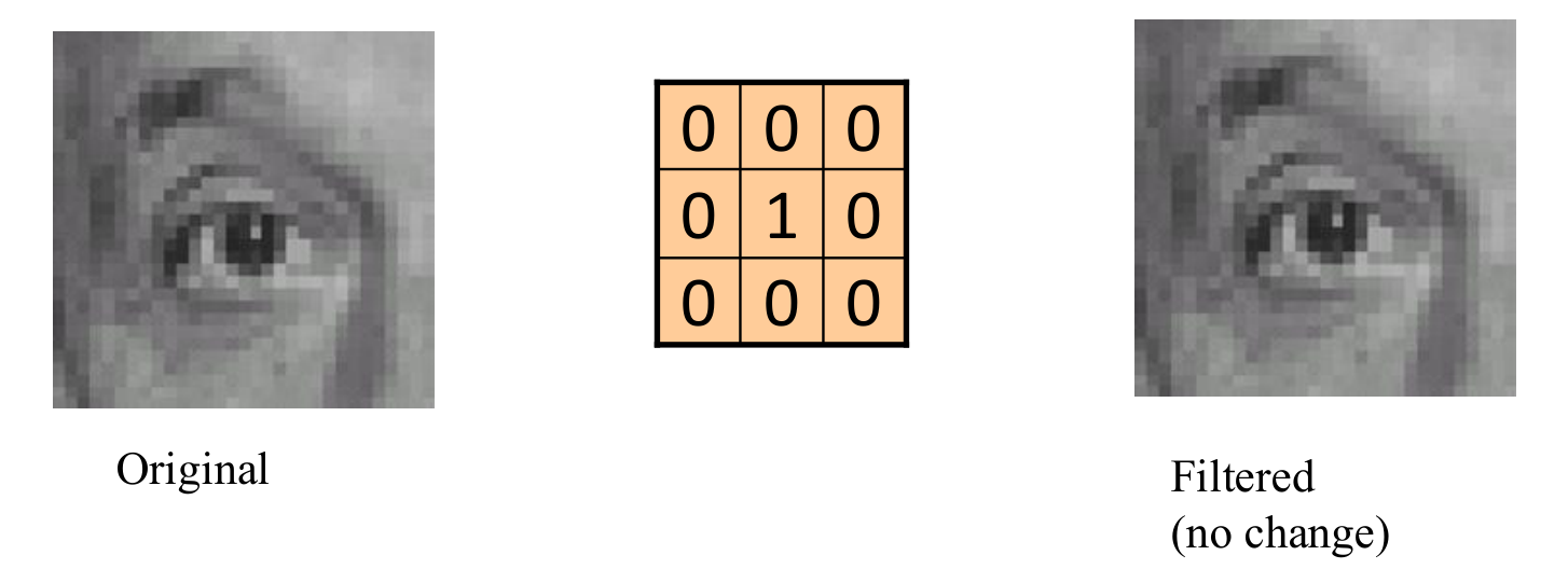 - Identity: A kernel with a 1 at the center and 0s elsewhere. The output is simply a copy of the original image.