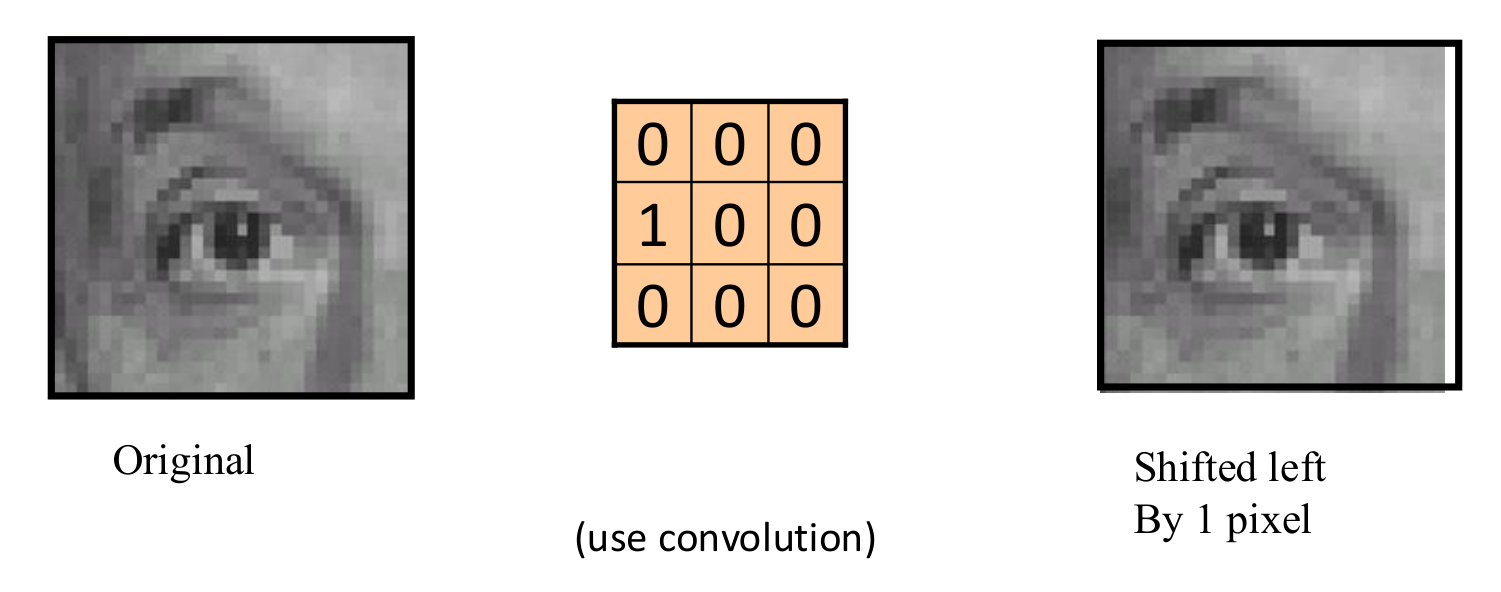 - Shift: A kernel with an off-center 1. This shifts the entire image in the opposite direction of the 1’s offset (for convolution).