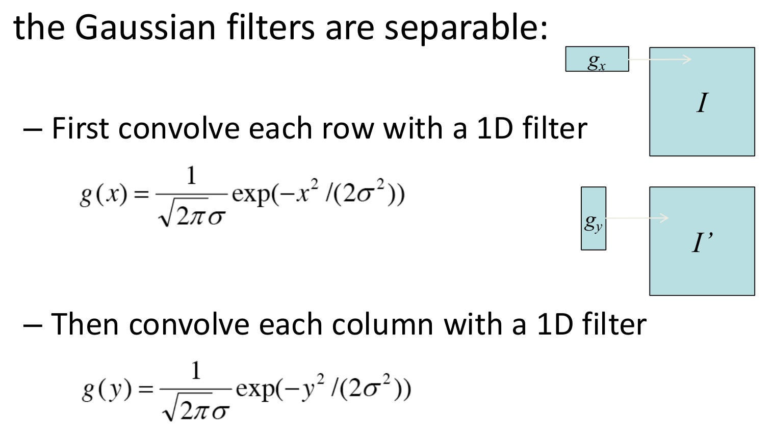 This means that convolving with a 2D Gaussian kernel is equivalent to first convolving every row with a 1D Gaussian, and then convolving every column of the result with the same 1D Gaussian. This reduces the computational complexity for an kernel from to operations per pixel—a massive speedup for large kernels.