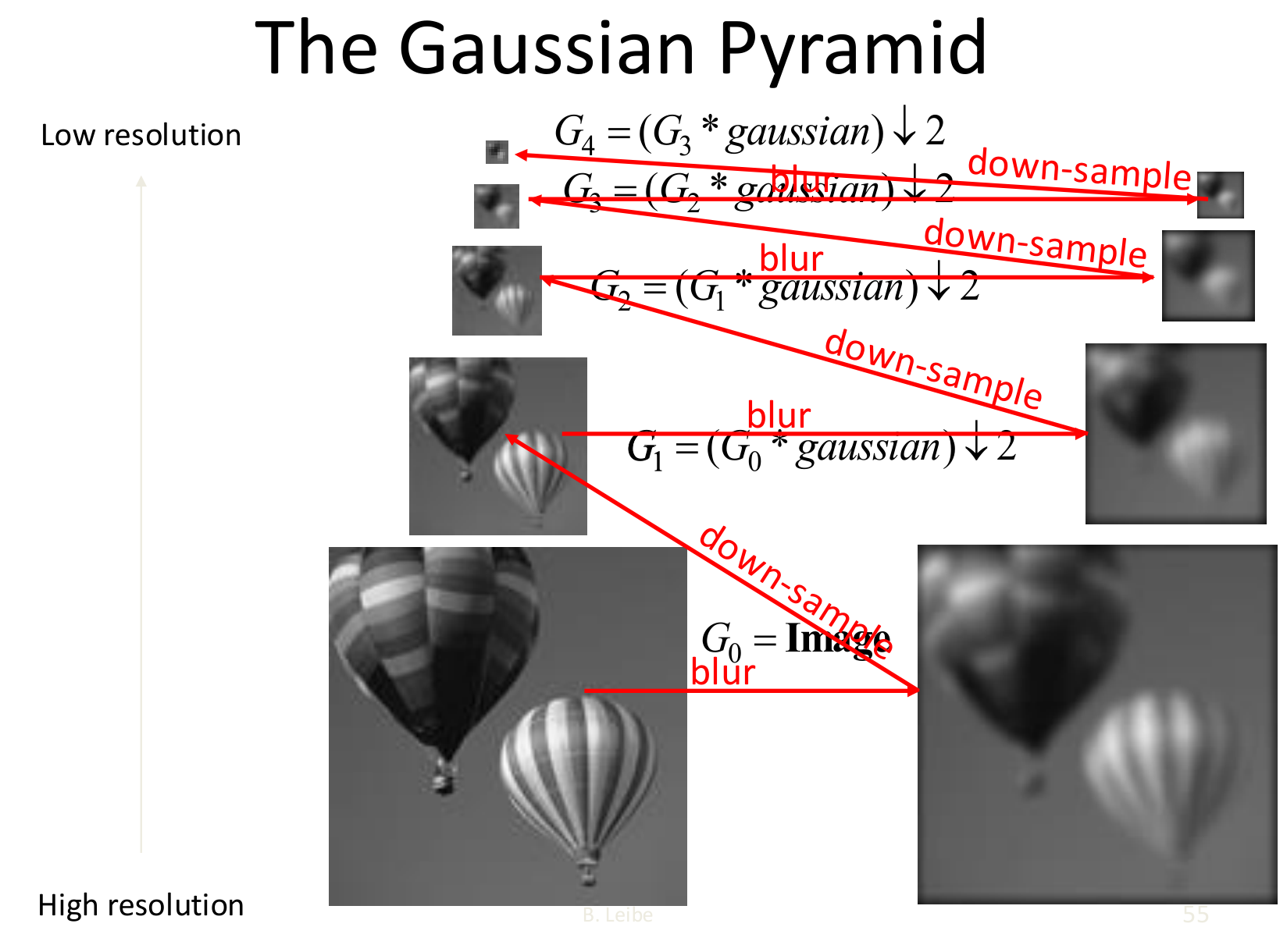 - Create the next level, , by convolving with a Gaussian filter and then down-sampling (e.g., by taking every other pixel).
