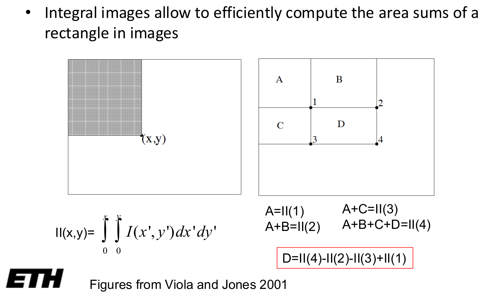 Once this integral image is computed (which takes a single pass over the image), the sum of pixels within any rectangular region can be computed with just four lookups into the integral image.