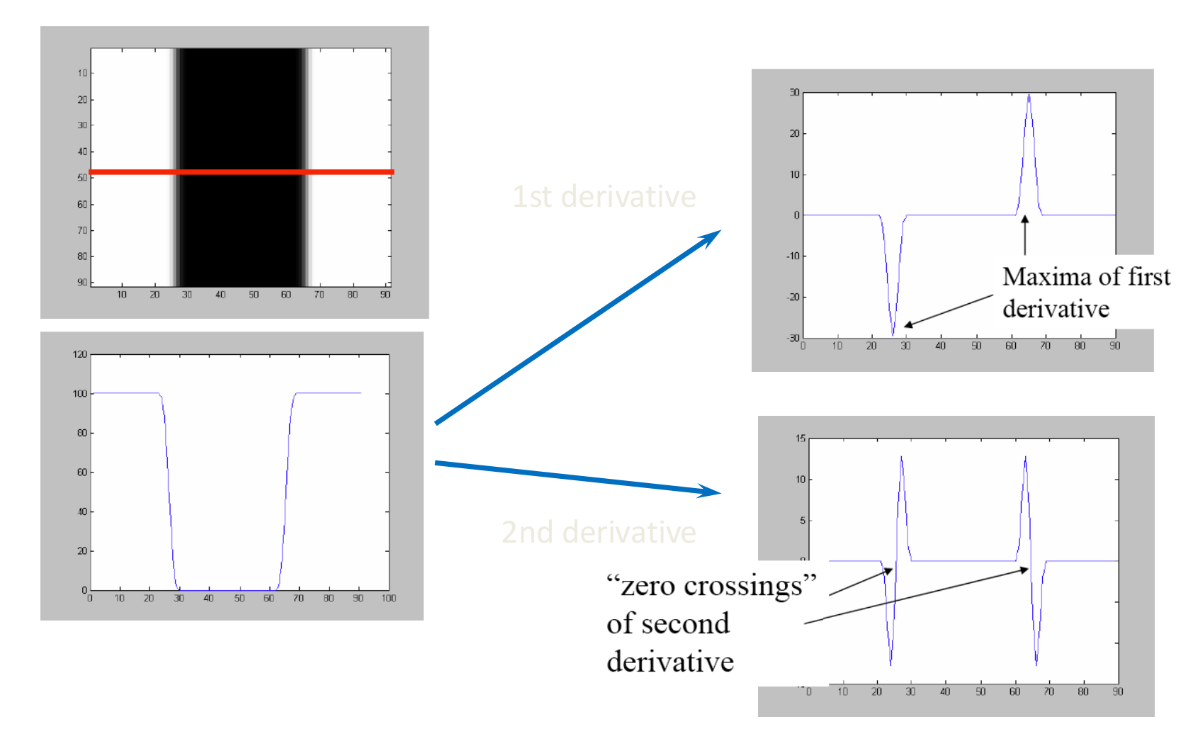 - The first derivative of this profile will have a peak (a maximum or minimum) at the location of the edge.