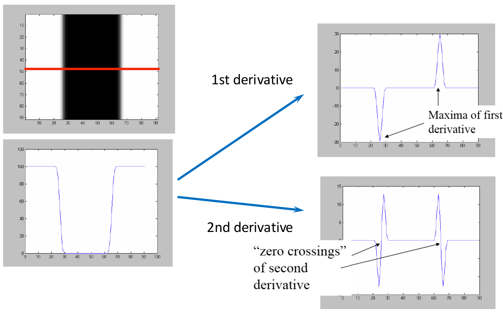 - The first derivative of this profile will have a peak (a maximum or minimum) at the location of the edge.