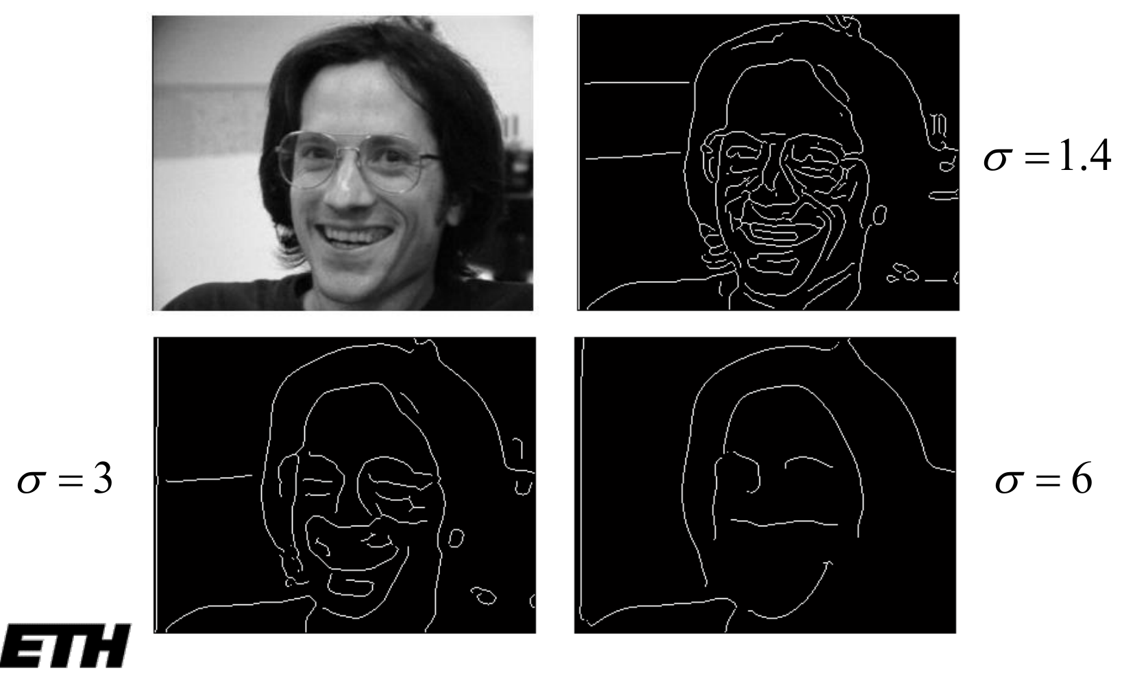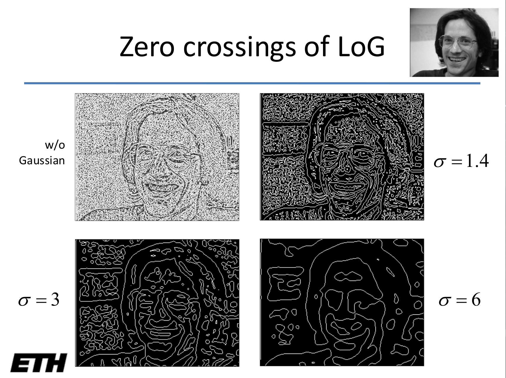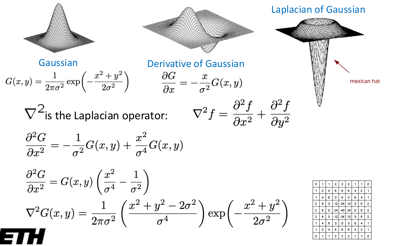 Applying the same “smooth first” principle, we can convolve our image with the Laplacian of a Gaussian (LoG). This filter, often called the “Mexican Hat” filter for its distinctive shape, finds edges at the zero-crossings of its response. The width of the Gaussian, , controls the scale of the edges being detected.