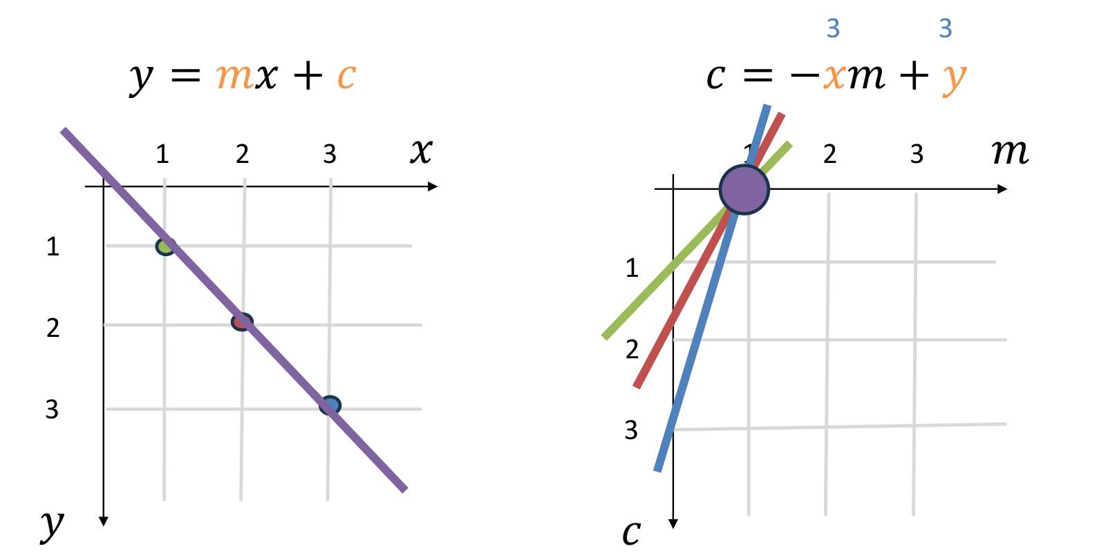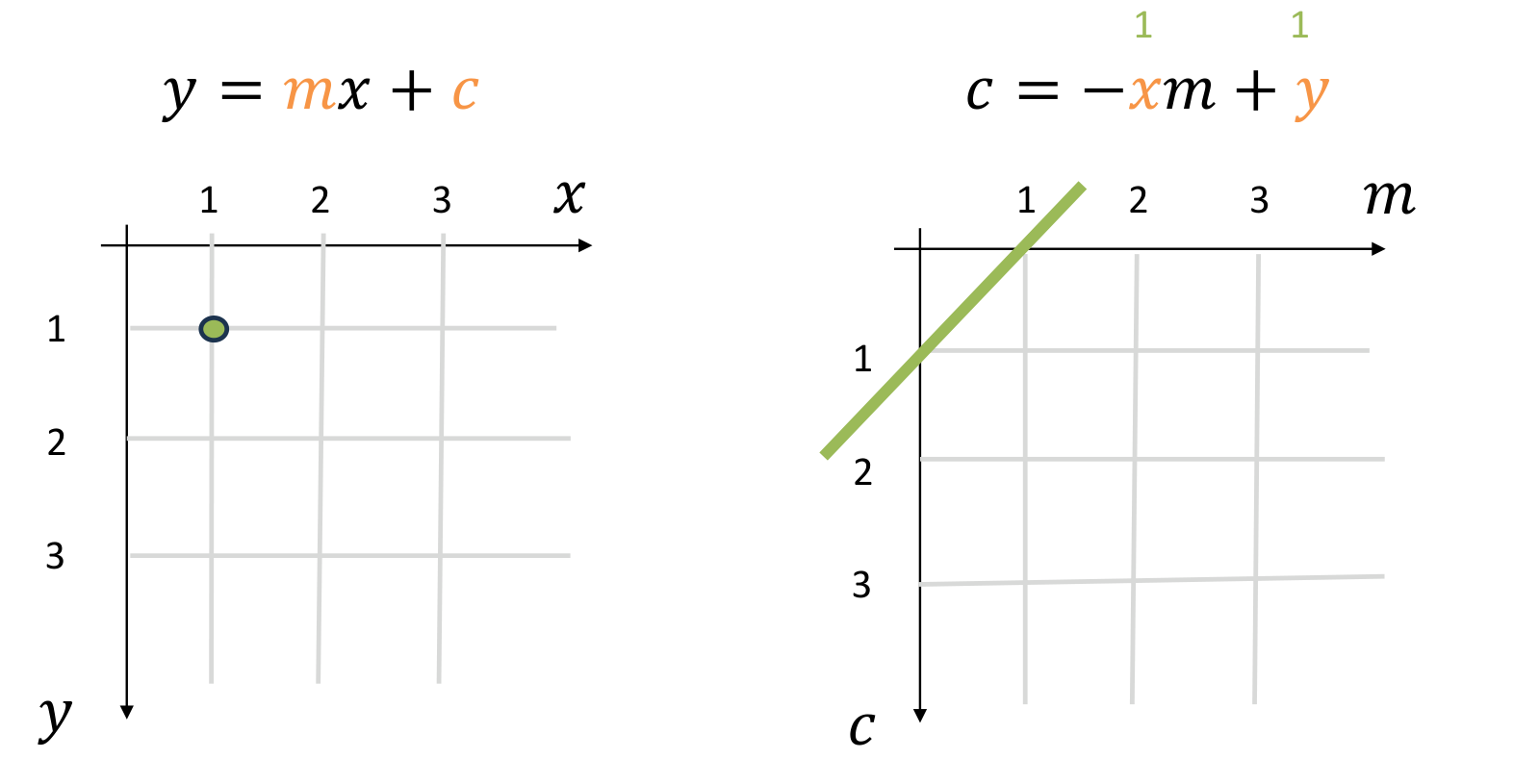 Consider the equation of a line: . This equation defines a relationship between image space and a parameter space .
