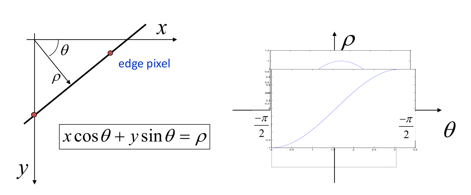 Here, a line is defined by its angle and its perpendicular distance from the origin . In this parameter space, a point in the image maps to a sinusoid. The voting process remains the same: collinear points will produce sinusoids that intersect at a single point in the Hough space.