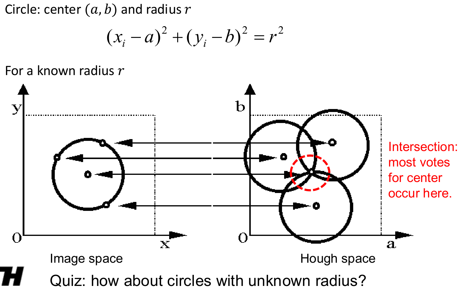 This voting principle is incredibly general. To find circles with a known radius , we can use the circle equation . Here, the parameter space is the 2D space of circle centers . Each edge point in the image votes for a circle of possible centers in the space. The intersection of these circles reveals the center of the circle in the image. If the radius is also unknown, the parameter space becomes 3D , and the voting process becomes more complex, but the principle remains the same.