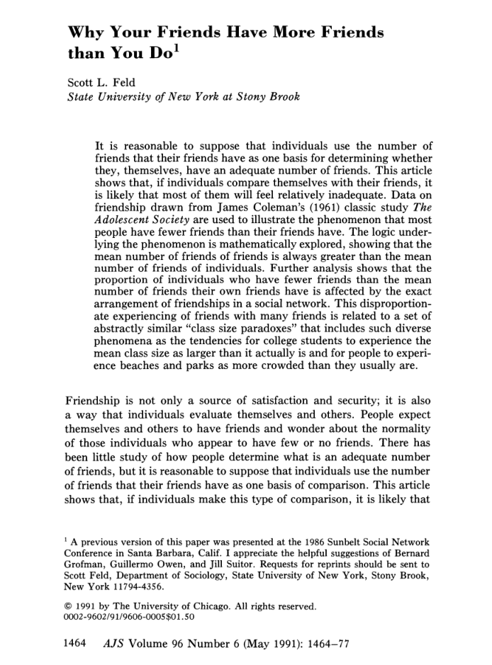 We begin with a provocative question that reveals a core principle of networks. Consider your friends, and then consider their friends. On average, who is more popular: you or your friends?