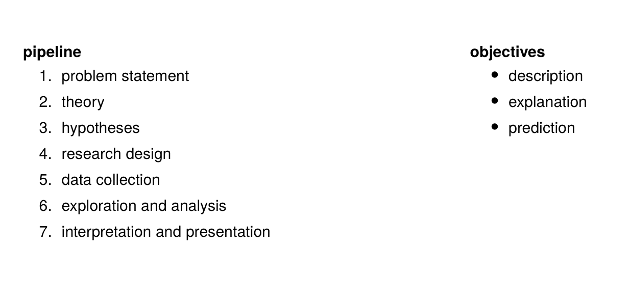 - Research Design: Define how to measure (operationalize) concepts and what data to use.