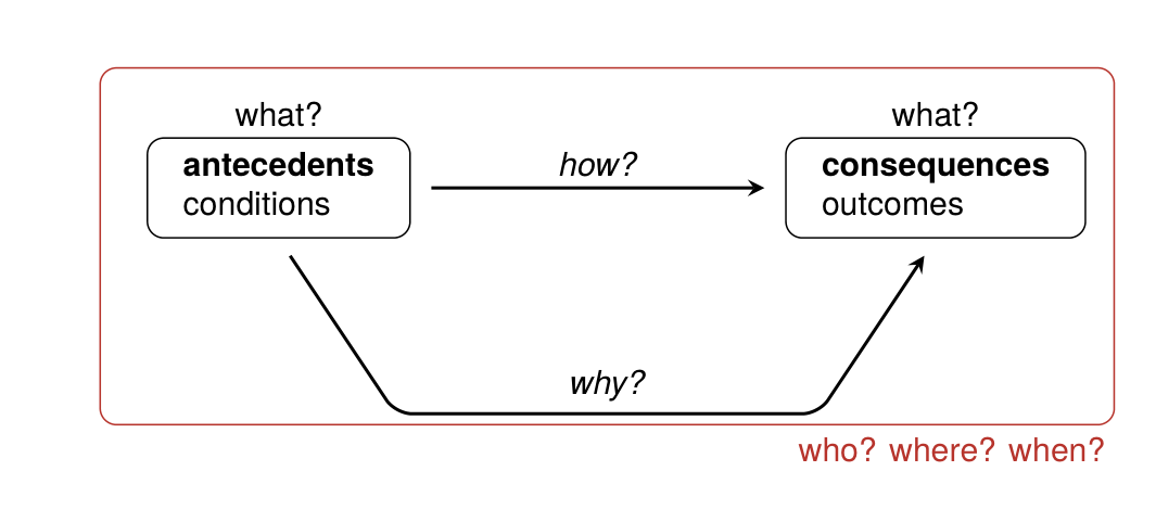 - What? (The Concepts): The core factors or variables, distinguished as antecedents (causes, inputs) and consequences (effects, outcomes).