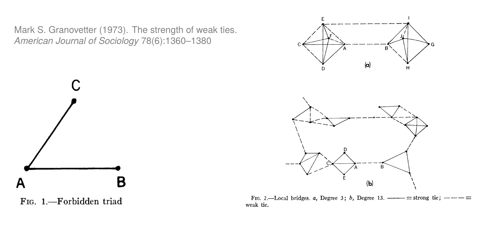 - The Mechanism: Triadic Closure: His argument centered on the local structure of triads (groups of three). He noted that if person A has a strong tie to B and a strong tie to C, the absence of a tie between B and C (the “Forbidden Triad”) is structurally unstable. Social pressure encourages B and C to form at least a weak tie, a process called triadic closure.