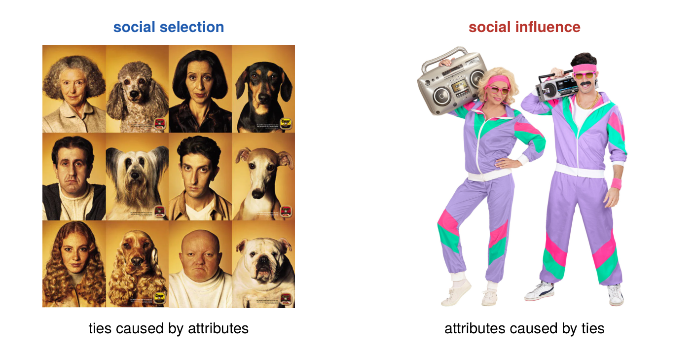 - Social Selection: Attributes drive tie formation. Individuals with shared attributes or behaviors select each other as friends.
