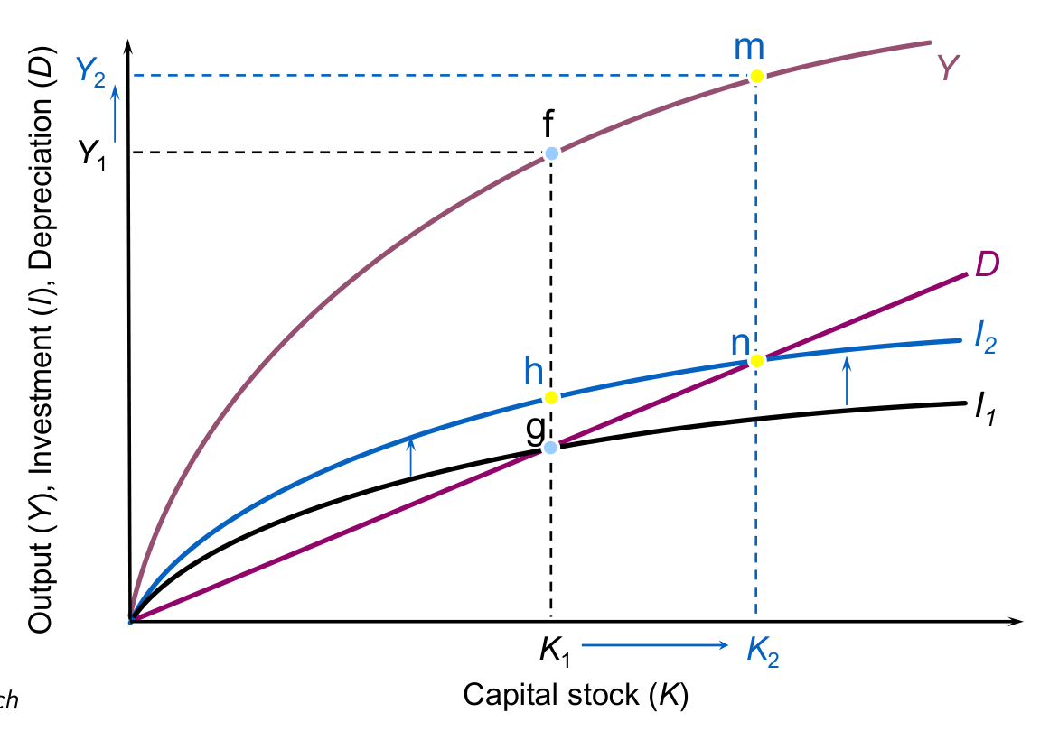 - If Investment > Depreciation (): Capital stock grows Higher output.