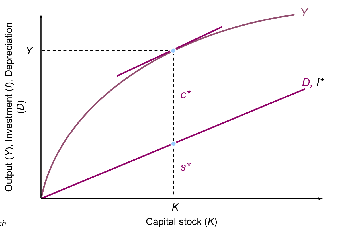 Consumption is the vertical distance between output () and investment (). This distance is maximized where the slope of the production function equals the slope of the depreciation line ().