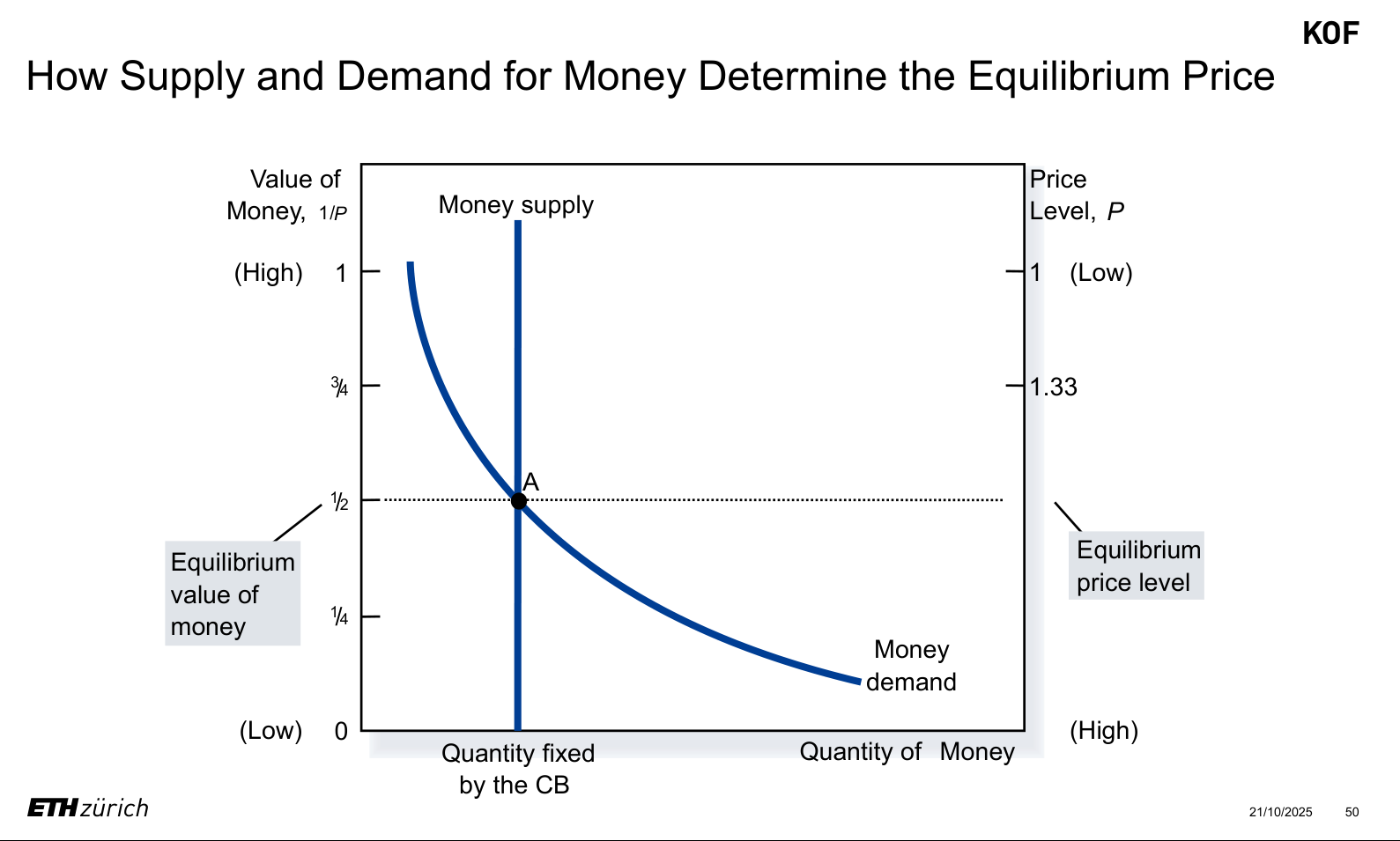 - Demand: Determined by how much wealth people choose to hold as liquid cash. Demand depends negatively on the value of money (if money is worth less, more is needed for transactions).
