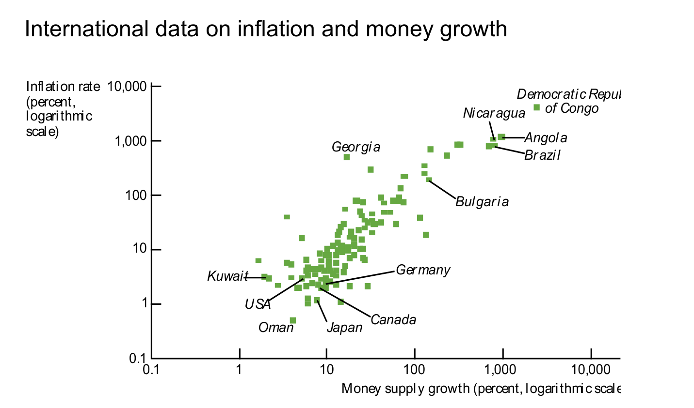 If Velocity () is stable, and Real Output () is determined by factors of production (and thus unaffected by money), then a change in must be reflected one-for-one in .