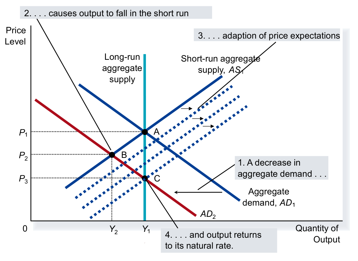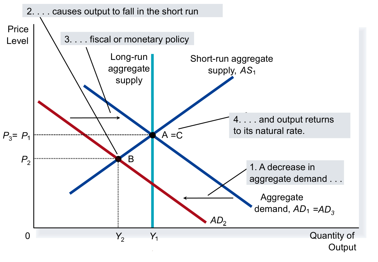 - Outcome: Economy moves to Point C. Output returns to potential (), but at a permanently lower price level ().